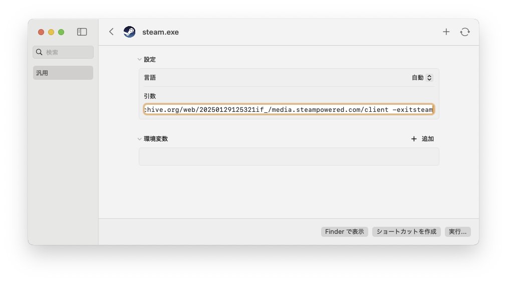1.steam.exe を引数(起動オプション)を付けて「-forcesteamupdate -forcepackagedownload -overridepackageurl http://web.archive.org/web/20250129125321if_/media.steampowered.com/client -exitsteam」で実行してSteamクライアントをダウングレード(2025 01/29版になる)