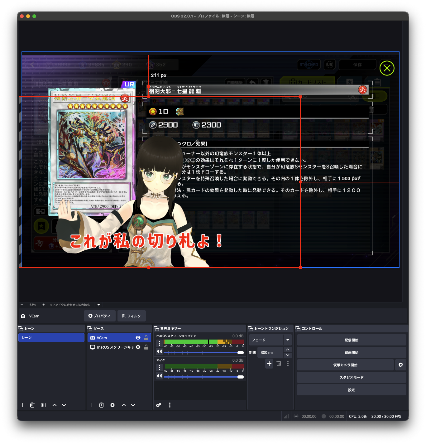 「OBS」で合成するとこんな感じ。OBS Pluginで背景を透過したアバターの「Vcam」ウィンドウがOBSに追加されます。