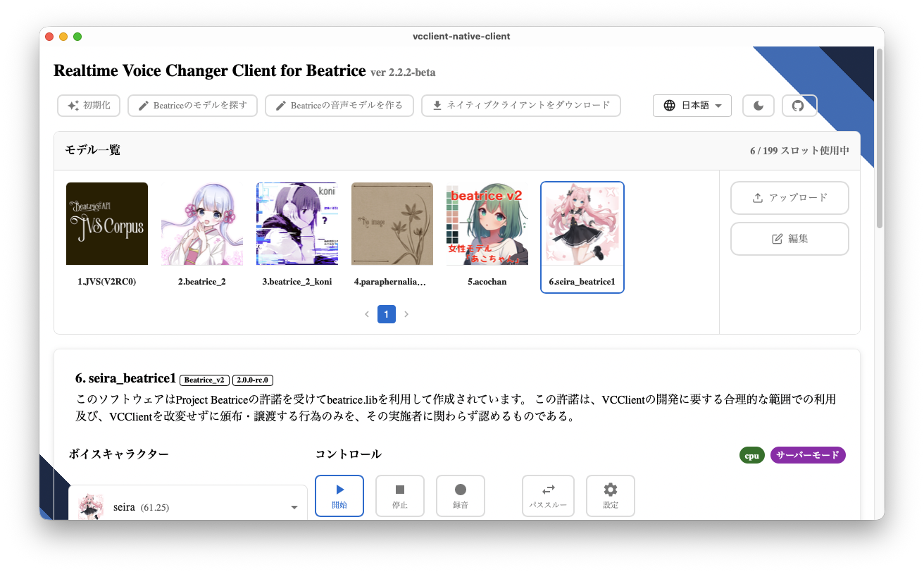 記事を書いている途中でOBSで「デスクトップ音声」の取り込みが簡単になり、使わない予定だったAi音声が「Beatrice」で遅延が少なくなって実用可能になったので急遽使用することに。 「VCClient」 のMac版で「Beatrice」用の「vcclient_std_win_2.2.2-beta_only_beatrice.zip」をDLしてインストールして「start_http.command」で起動。
