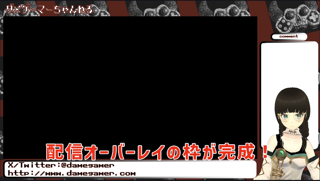 キャラとゲーム画面が重なるとゲーム画面の視認性が悪くなるのでゲーム画面とは別に背景(1920 X 1080)を用意して、ゲーム画面用の枠(1528 X 860)をOBSで縮小してハメ込んで、チャンネルタイトルやコメント欄やX(Twitter)などの情報を載せたVtuberの定番みたいなあの背景画面が「配信オーバーレイ」です。配布されているものを使ったり「BOOTH」 で買ったりすればOBSにオーバーレイの画像を1枚追加するだけですみます。
