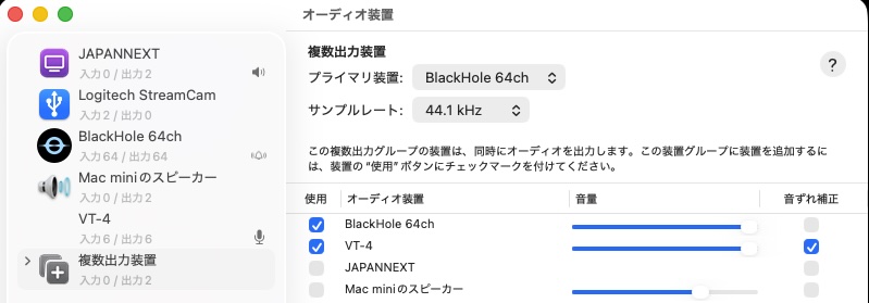 ・2、Macのアプリ>ユーティリティ「オーディオ・MIDI設定」を選択。下部の+を押して「複数出力装置を作成」を選びます。「BlackHole 64ch」と「VT-4」にチェックを入れます。これで2つを組み合わせた複数入力装置ができます。