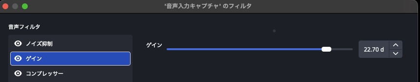 声を入れる場合はマイクの声は「音声入力キャプチャー」でOBSに追加しているハズなので「音声入力キャプチャー」の「フィルタ」を選択。下の+ボタンを押せば各種フィルタが追加できるが「ゲイン」を追加 。ゲインの数値を上げると音が大きくなります。足らないようなら「コンプレッサー」でも音を大きくできるし、最終手段として「ゲイン」をもう一つ追加して二重に「ゲイン」をかけることもできます。これで音量ミキサーのゲージを「通常の声を出した時に黄色のゲージに行く」 ように調節して下さい。通常は黄色、大声を出した時は赤って感じで調整します。緑の下ぐらいの状態だとほとんど聞こえません。ノイズが酷い場合は「ノイズ抑制」を付けて対処するが、ノイズ抑制を使う場合は必ずフィルタの先頭が「ノイズ抑制」になるように順番を調整しないといけません。これでマイクテストして音量調節して試しに録画して音量に問題がないか確認しましょう。